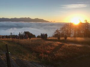 標高1,955mの山頂からは、八ヶ岳全山をはじめ、富士山、南・中央・北アルプスまで見渡せます。ガイドがそれぞれの山の名前やエピソードを詳しく解説します。